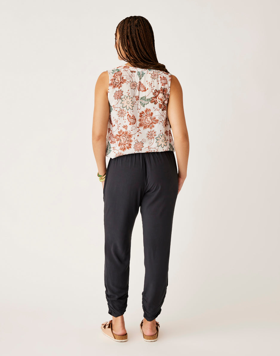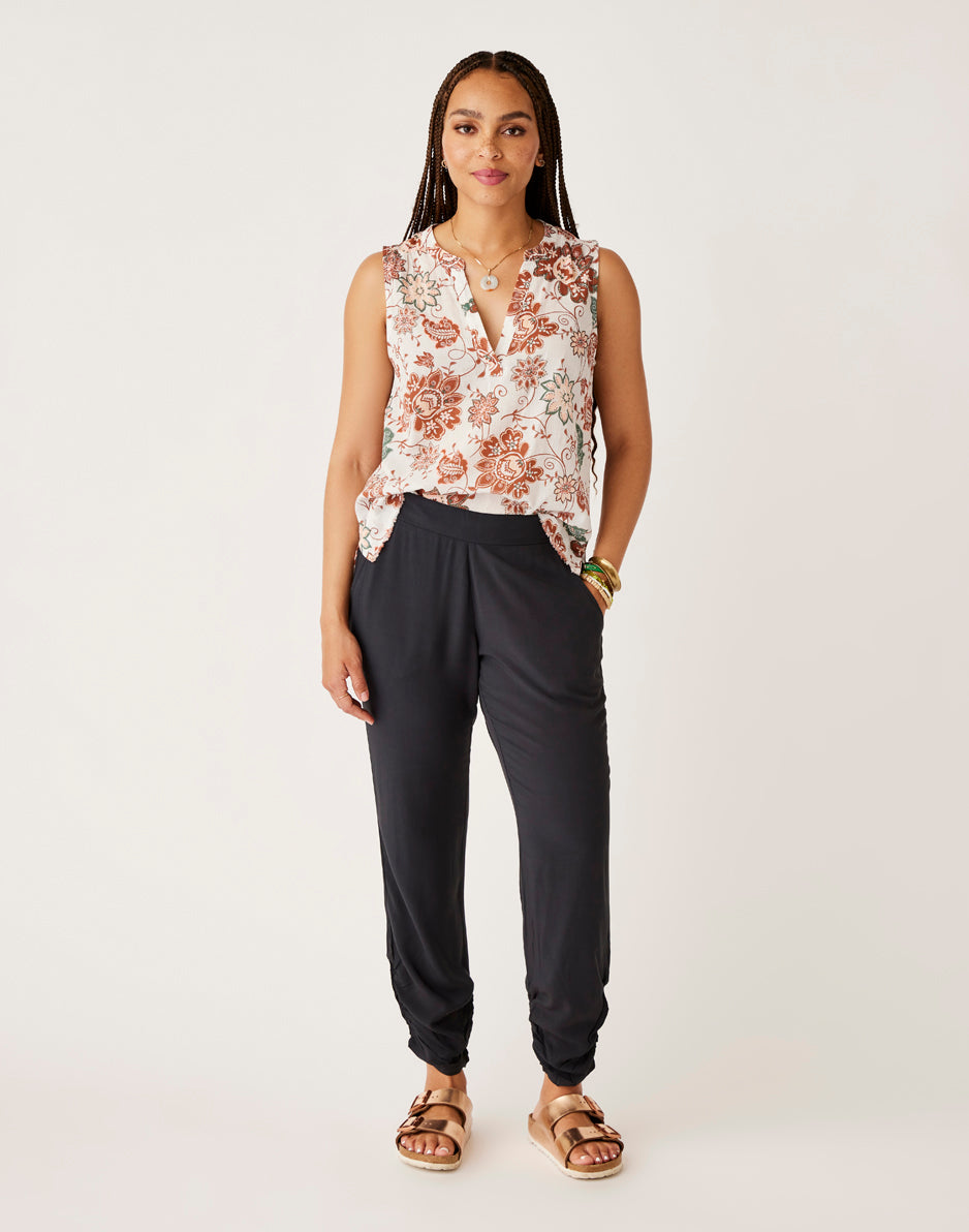 A classic beach pant to wear over a bathing suit or around a bonfire. These pants are made of a silky material and are also designed to be dressed up with a nice top and sandals. Ruched leg opening at bottom are a cute and flattering detail.