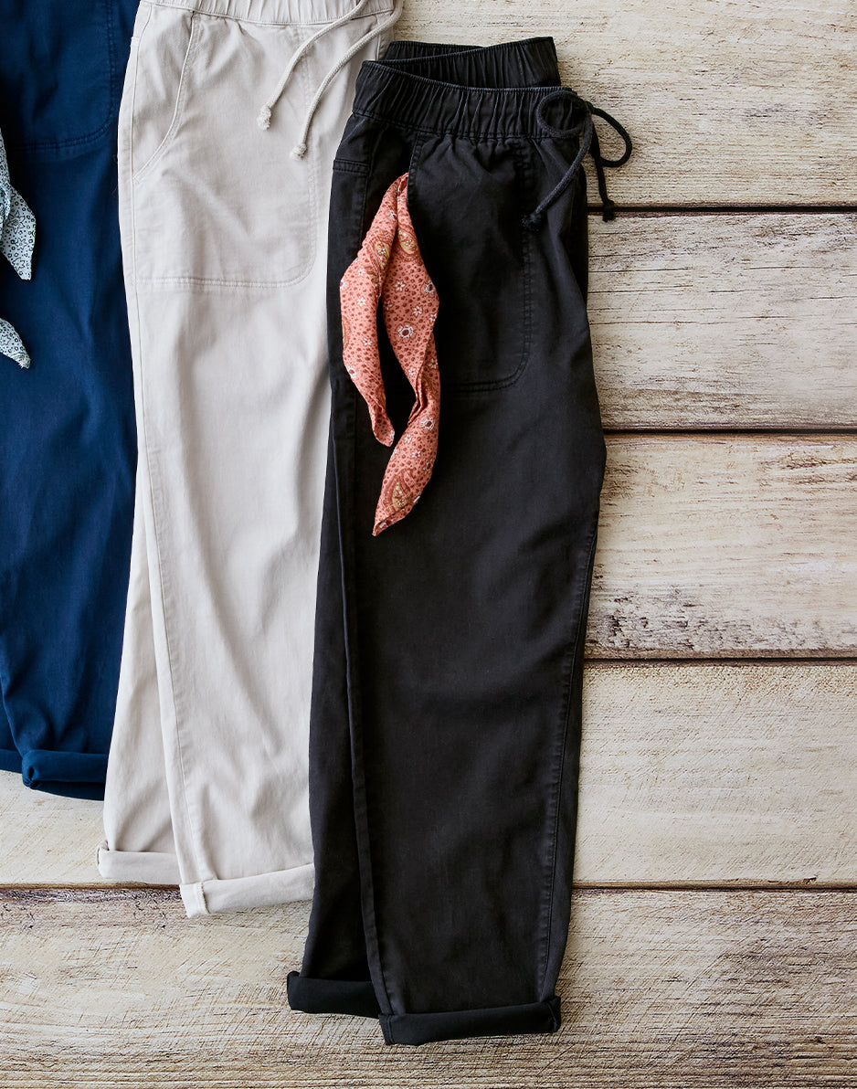 Put a bounce in your step with the casual comfort and competence of the Zoe. This easy pull-on pant with elastic waistband with draw cord is ready for whatever your day demands.