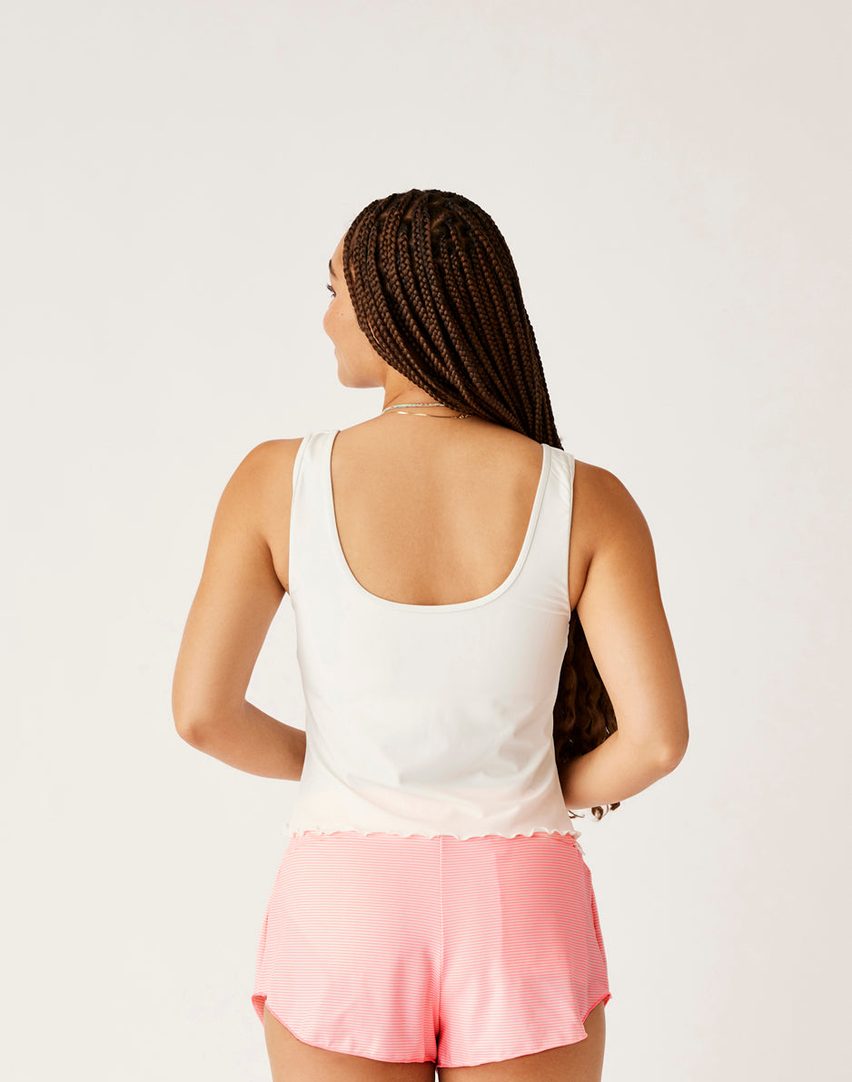 Business on top and party on the bottom is a recipe for success and the Vida Notchneck Tankini is no exception, with its merrow hem detail, floating shelf bra with removable pads.