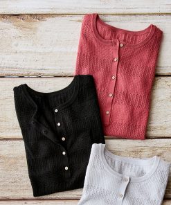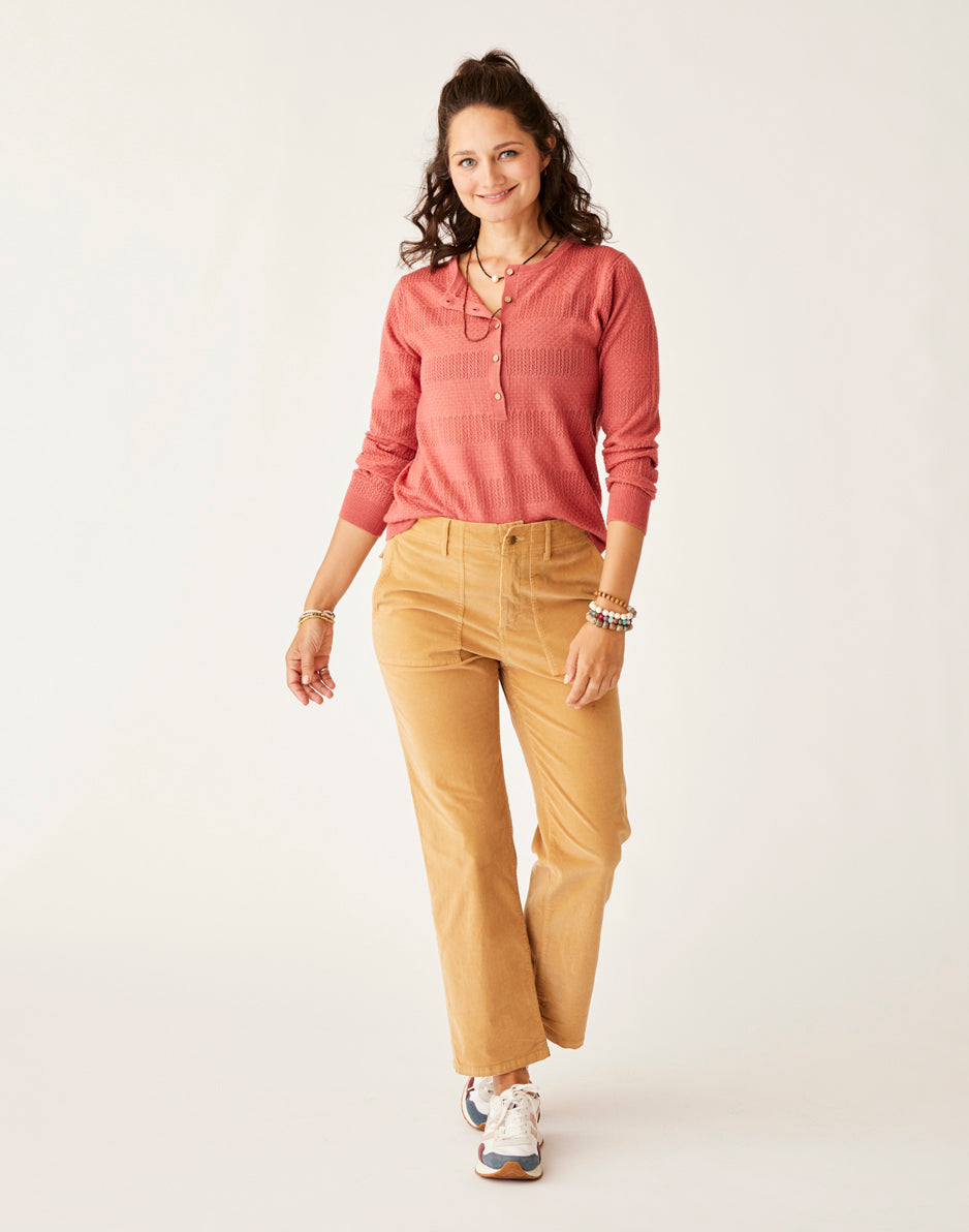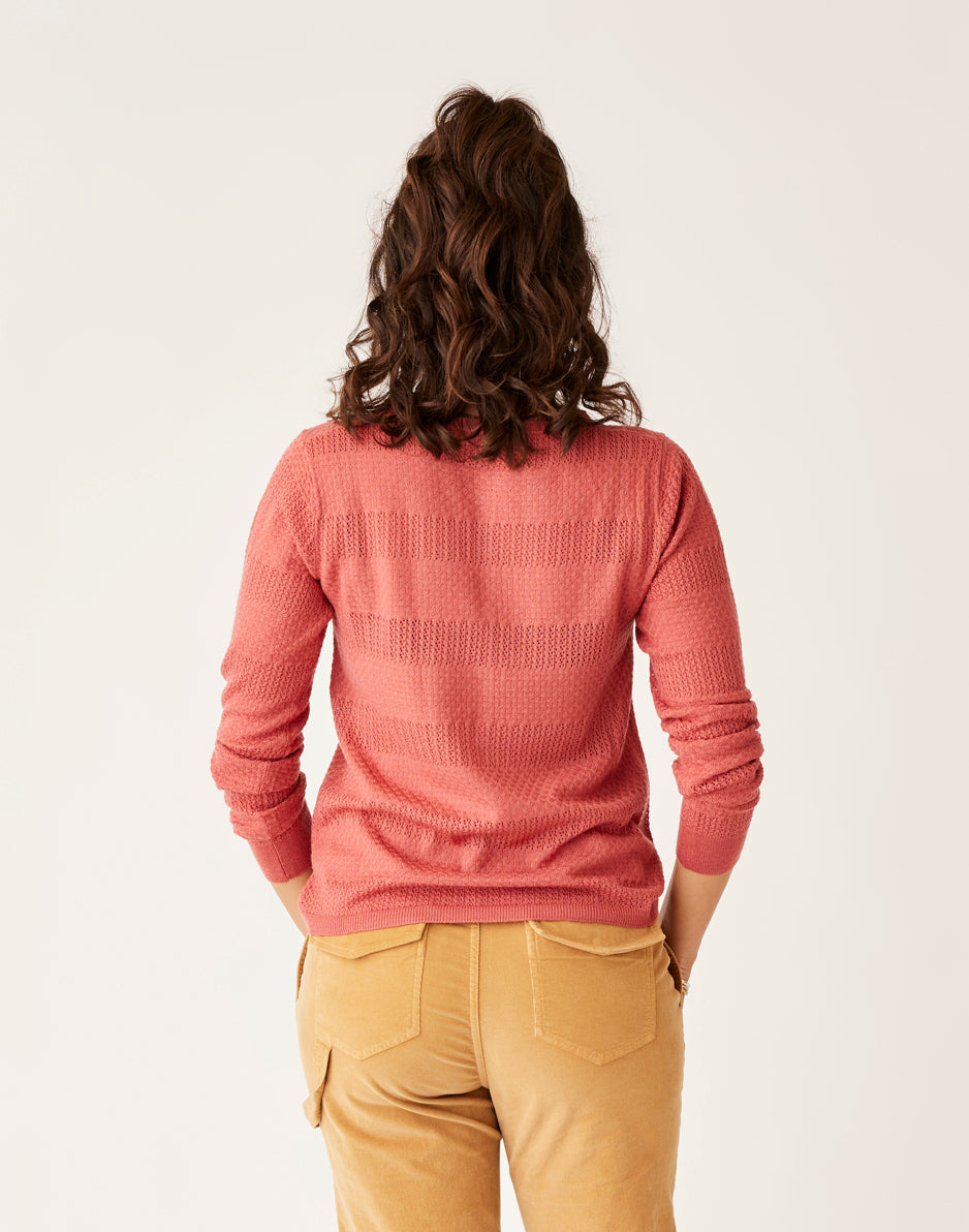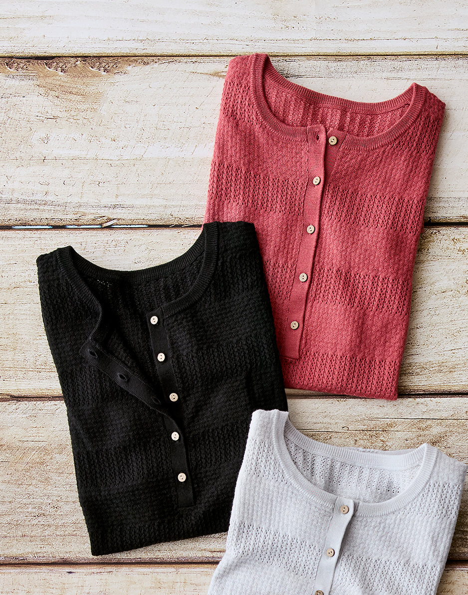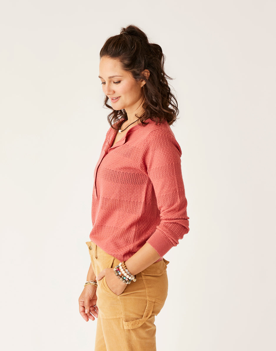 This rock steady layering piece goes with everything without missing a beat. Recycled Tahoe Fabric, allover pointelle stitch and coconut shell buttons bring little details that drop the mic.