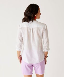 Simple sophistication make this lightweight summer top a weekend bag must. Chest pockets and three button open V-neck dial in the vibe in stride.