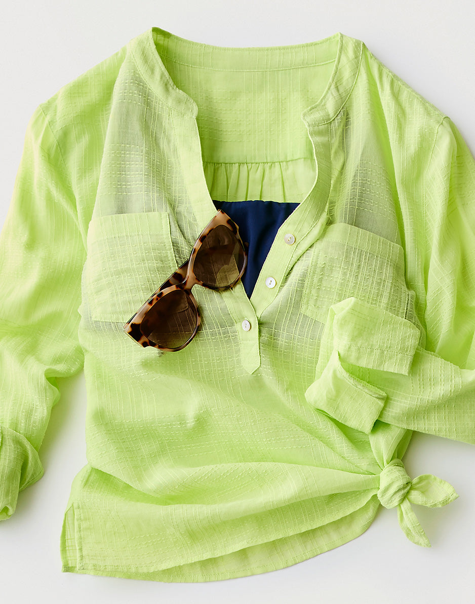Simple sophistication make this lightweight summer top a weekend bag must. Chest pockets and three button open V-neck dial in the vibe in stride.