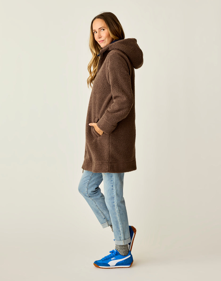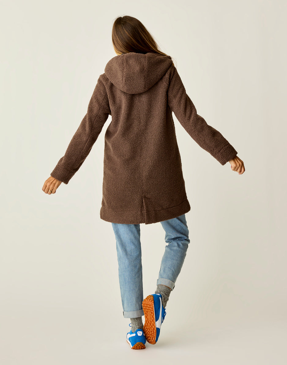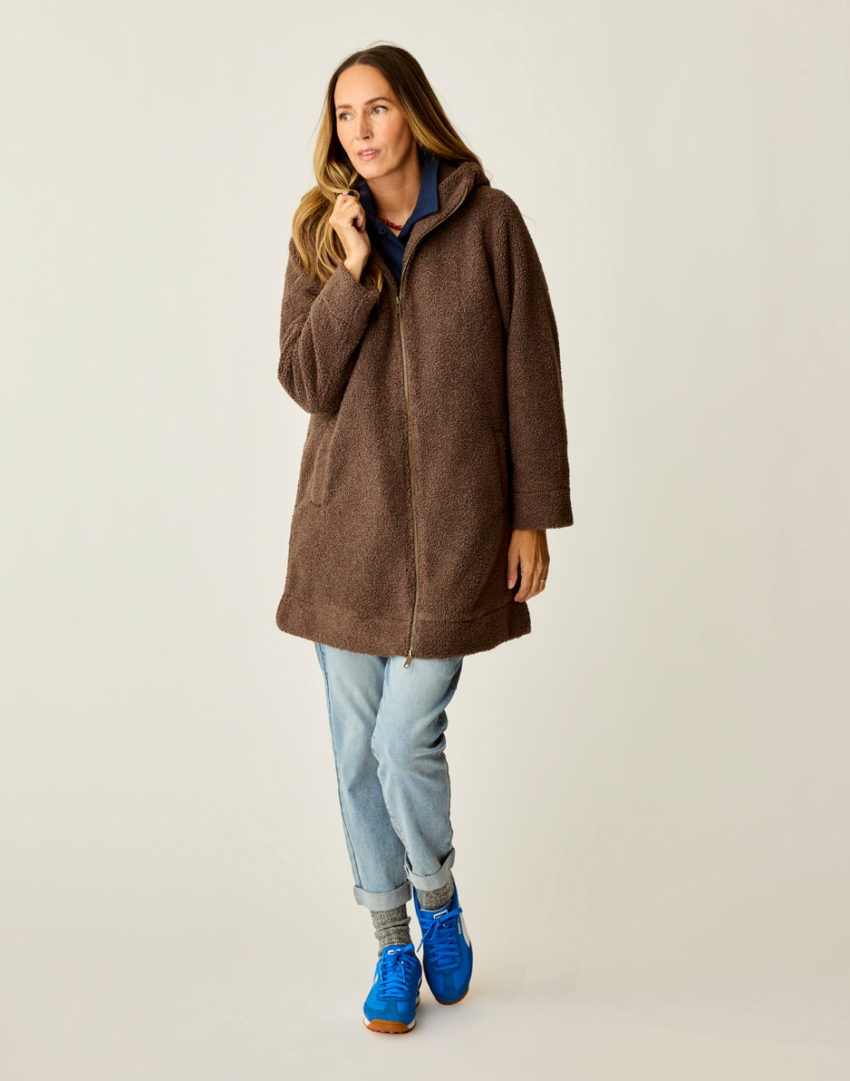 Cracking the code on staying warm and looking good doing it? We did it with the Indy. Made from our soft Boucle Fleece and lined with sateen, she’s designed with a slouchier relaxed fit and finished with a cozy hood. Stay totally toasty while keeping things effortlessly cool. Prefer something more structured without a hood? Meet the Sutton Boucle Jacket.